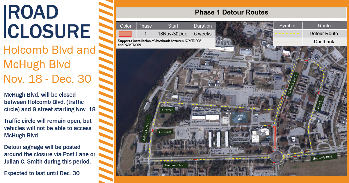 Due to a military construction project, McHugh Blvd. will be closed between Holcomb Blvd. (traffic circle) and G Street beginning Monday, Nov. 18, 2024. The full traffic circle will remain open, but vehicles will not be able to access McHugh Blvd. Detour signage will be in place to route traffic around the closure via Post Lane or Julian C. Smith during this period. This closure is expected to last until Dec. 30, 2024. This is a four-phase project, and future closures will be announced in December.